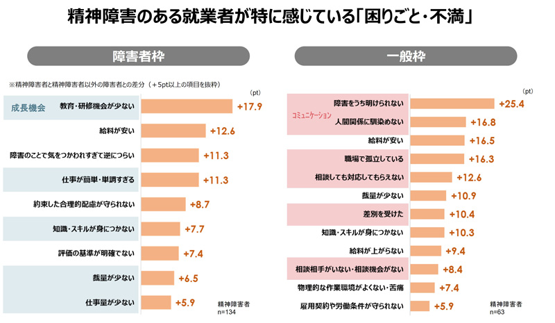 パーソル総合研究所の調査によると、精神障害のある就業者のはたらく上での困りごとや不満について、障害者枠ではたらいている人では「教育・研修機会が少ない」「仕事が簡単・単調すぎる」といった『成長機会のなさ』が多く、一般枠ではたらいている人では、「障害をうち明けられない」「人間関係に馴染めない」などの『コミュニケーション』に関する困りごと・不満が多い傾向が見られました。